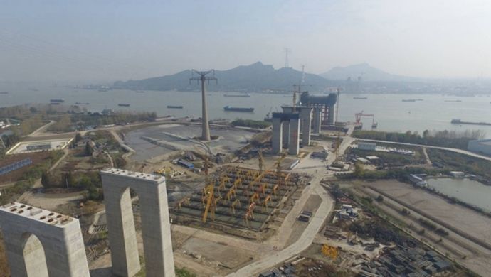 五峰山長江特大橋位于泰州長江大橋和潤揚長江大橋之間,其北岸位于鎮(zhèn)江市丹徒區(qū)高橋鎮(zhèn),南岸位于鎮(zhèn)江新區(qū)五峰山腳下,是連鎮(zhèn)鐵路和京滬高速公路南延的關鍵控制性工程。大橋全長6409米,其中主跨為1092米,采用單跨懸吊鋼桁梁懸索結構,上層為8車道高速公路,設計速度每小時100公里;下層為4線高速鐵路,設計速度每小時250公里。