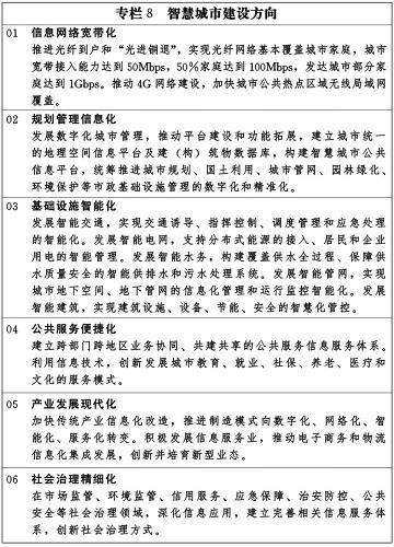 統籌城市發展的物質資源、信息資源和智力資源利用,推動物聯網、云計算、大數據等新一代信息技術創新應用,實現與城市經濟社會發展深度融合。強化信息網絡、數據中心等信息基礎設施建設。促進跨部門、跨行業、跨地區的政務信息共享和業務協同,強化信息資源社會化開發利用,推廣智慧化信息應用和新型信息服務,促進城市規劃管理信息化、基礎設施智能化、公共服務便捷化、產業發展現代化、社會治理精細化。增強城市要害信息系統和關鍵信息資源的安全保障能力。