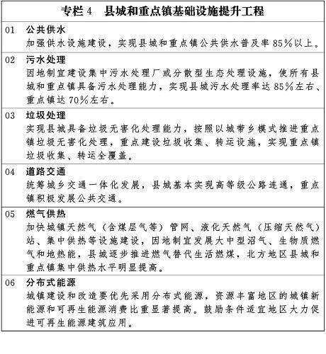 加快農村飲水安全建設,因地制宜采取集中供水、分散供水和城鎮供水管網向農村延伸的方式解決農村人口飲用水安全問題。繼續實施農村電網改造升級工程,提高農村供電能力和可性,實現城鄉用電同網同價。加強以太陽能、生物沼氣為重點的清潔能源建設及相關技術服務?;就瓿赊r村危房改造。完善農村公路網絡,實現行政村通班車。加強鄉村旅游服務網絡、農村郵政設施和寬帶網絡建設,改善農村消防安全條件。繼續實施新農村現代流通網絡工程,培育面向農村的大型流通企業,增加農村商品零售、餐飲及其他生活服務網點。深入開展農村環境綜合整治,實施鄉村清潔工程,開展村莊整治,推進農村垃圾、污水處理和土壤環境整治,加快農村河道、水環境整治,嚴禁城市和工業污染向農村擴散。