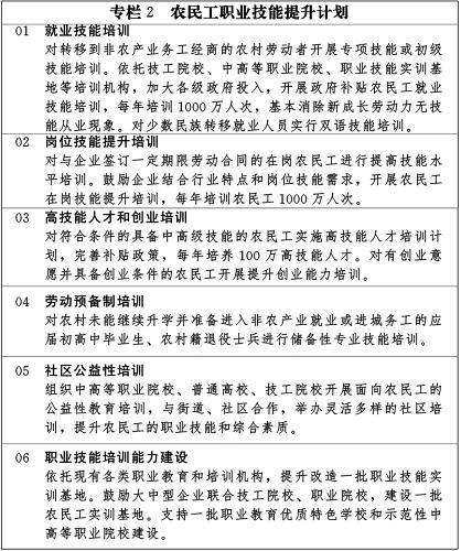 加強農民工職業技能培訓,提高就業創業能力和職業素質。整合職業教育和培訓資源,全面提供政府補貼職業技能培訓服務。強化企業開展農民工崗位技能培訓責任,足額提取并合理使用職工教育培訓經費。鼓勵高等學校、各類職業院校和培訓機構積極開展職業教育和技能培訓,推進職業技能實訓基地建設。鼓勵農民工取得職業資格證書和專項職業能力證書,并按規定給予職業技能鑒定補貼。加大農民工創業政策扶持力度,健全農民工勞動權益保護機制。實現就業信息全國聯網,為農民工提供免費的就業信息和政策咨詢。