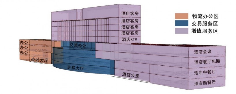 區(qū)別于傳統(tǒng)鐵路貨場散點(diǎn)式的的生產(chǎn)配套房屋布局規(guī)劃,嘉寶物流園區(qū)在西南角集中建設(shè)了一幢九層高,總建筑面積約4.2萬平米的嘉寶物流大廈,作為園區(qū)的標(biāo)志性建筑物及綜合性服務(wù)大樓,其功能不緊緊涵蓋了服務(wù)物流園的基本生產(chǎn)管理功能,同時(shí)也承擔(dān)了為嘉寶物流園區(qū)提供各項(xiàng)增值服務(wù)的經(jīng)濟(jì)開發(fā)功能(圖9)。其主要功能包括:網(wǎng)上交易、流通加工、貨運(yùn)代理、貿(mào)易、金融、工商、咨詢、會(huì)議餐飲、酒店住宿等各種綜合服務(wù)性功能(圖10)。集約式的規(guī)劃布局既可以充分提高園區(qū)土地利用率及生產(chǎn)組織管理效率,還可以提升園區(qū)室內(nèi)外環(huán)境品質(zhì),統(tǒng)領(lǐng)園區(qū)的整體形象。