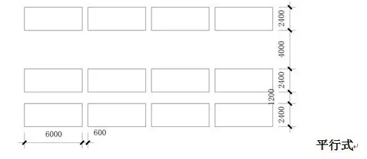 根據(jù)地形條件以占地面積小、疏散方便、保證安全為原則,主要停車方式有平行式、斜列式、垂直式三種。其中間最小距離以小型車為例,停車方式見下圖