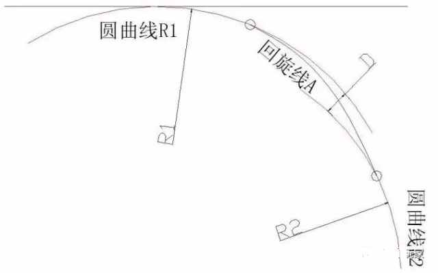 (1)卵型上的回旋參數(shù)A不應(yīng)小于該級公路關(guān)于回旋線最小參數(shù)的規(guī)定,同時宜在下列界限內(nèi):R2/2≤ A≤ R2(R2為小圓半徑);