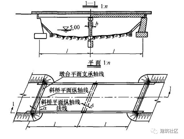 4)斜橋傾斜角a,應采用斜橋平面縱軸線的法線與墩臺平面支承軸線的夾角標注(圖2-64)。