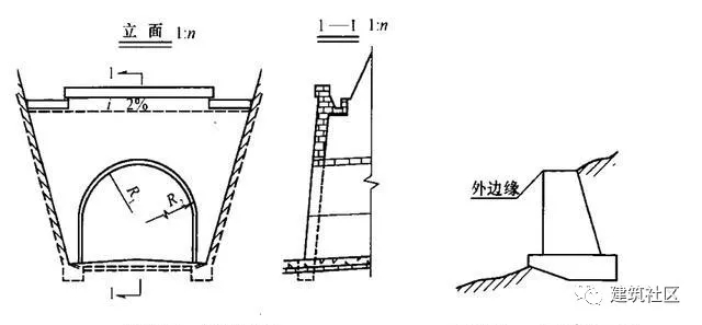 (7)隧道洞門的正投影應為隧道立面。無論洞門是否對稱均應全部繪制。洞頂排水溝應在立面圖中用標有坡度符號的虛線表示。隧道平面與縱斷面可僅示洞口的外露部分(圖2-66).