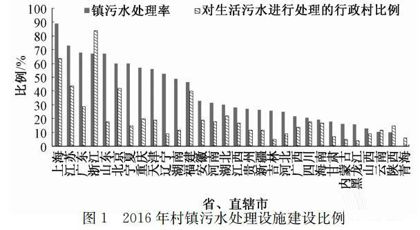 村鎮(zhèn)污水處理在我國剛剛起步,污水處理設施建設落后于經(jīng)濟發(fā)展的速度。截至2016年底,全國對生活污水進行處理的建制鎮(zhèn)比例為52.64%,也就是說全國有18 099個建制鎮(zhèn),其中13 028個沒有污水處理設施,同時已建成的污水處理設施不到一半尚可正常運行;對生活污水進行處理的行政村占20%。仍有大量地區(qū)的農(nóng)村污水處理設施處于空白。圖1表明各省市行政村污水處理設施建設情況,地區(qū)差異較為明顯。上海、江蘇、浙江、山東等省市建制鎮(zhèn)污水處理率較高的地區(qū)可達到89.18%,行政村比例達到64%、44%、84%和18%,西北、東北地區(qū)僅為0.01%~25.7%。考慮到農(nóng)村污水治理建設費用巨大、農(nóng)村管理能力不足等因素,參照國外發(fā)達國家治理歷程,全面實現(xiàn)農(nóng)村污水治理還需較長時間努力。當前,在大幅度提高建制鎮(zhèn)污水處理率基礎上,重點推動經(jīng)濟發(fā)達地區(qū)、生態(tài)環(huán)境敏感、人口密集等地區(qū)農(nóng)村污水治理,梯次推進農(nóng)村生活污水治理。