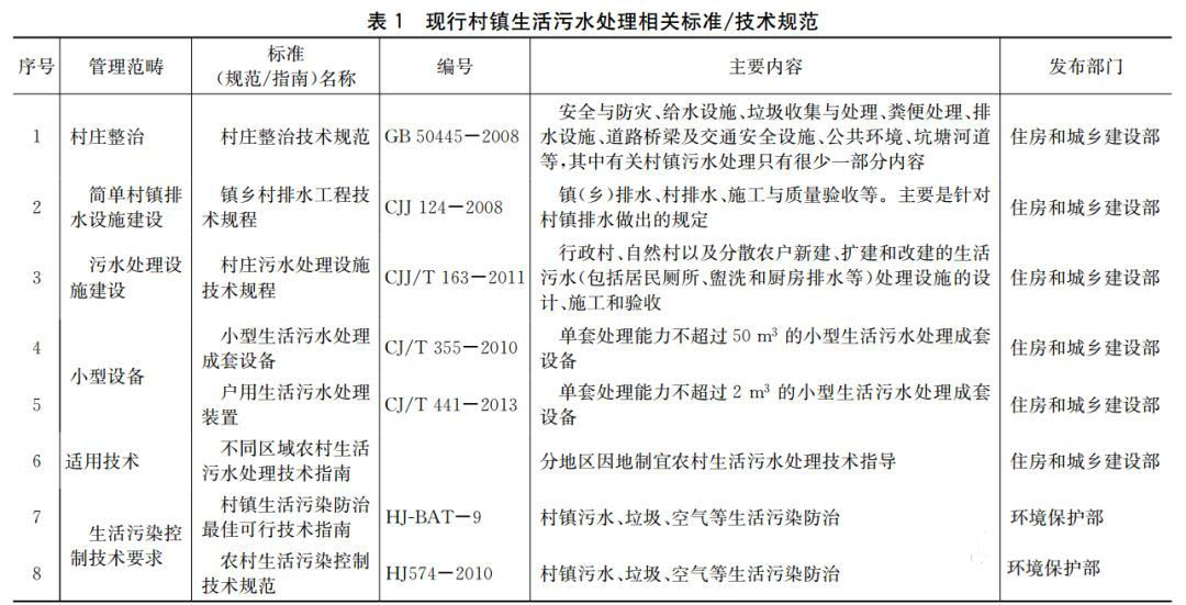 村鎮(zhèn)污水處理技術(shù)相關標準的制定,對規(guī)范整個行業(yè)的技術(shù)發(fā)展起著重要作用。從2008年以來,住建和環(huán)保等部門相繼發(fā)布了一系列村鎮(zhèn)生活污水處理技術(shù)標準指南指導建設工作,如表1所示。以上標準的出臺對于規(guī)范管理村鎮(zhèn)污水處理設施的建設起到了一定的作用。