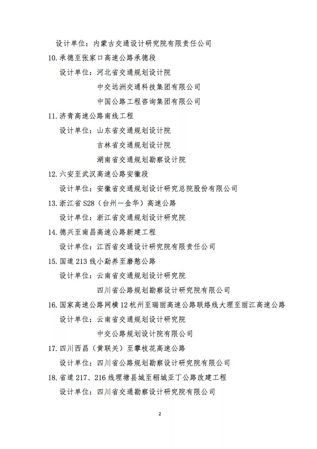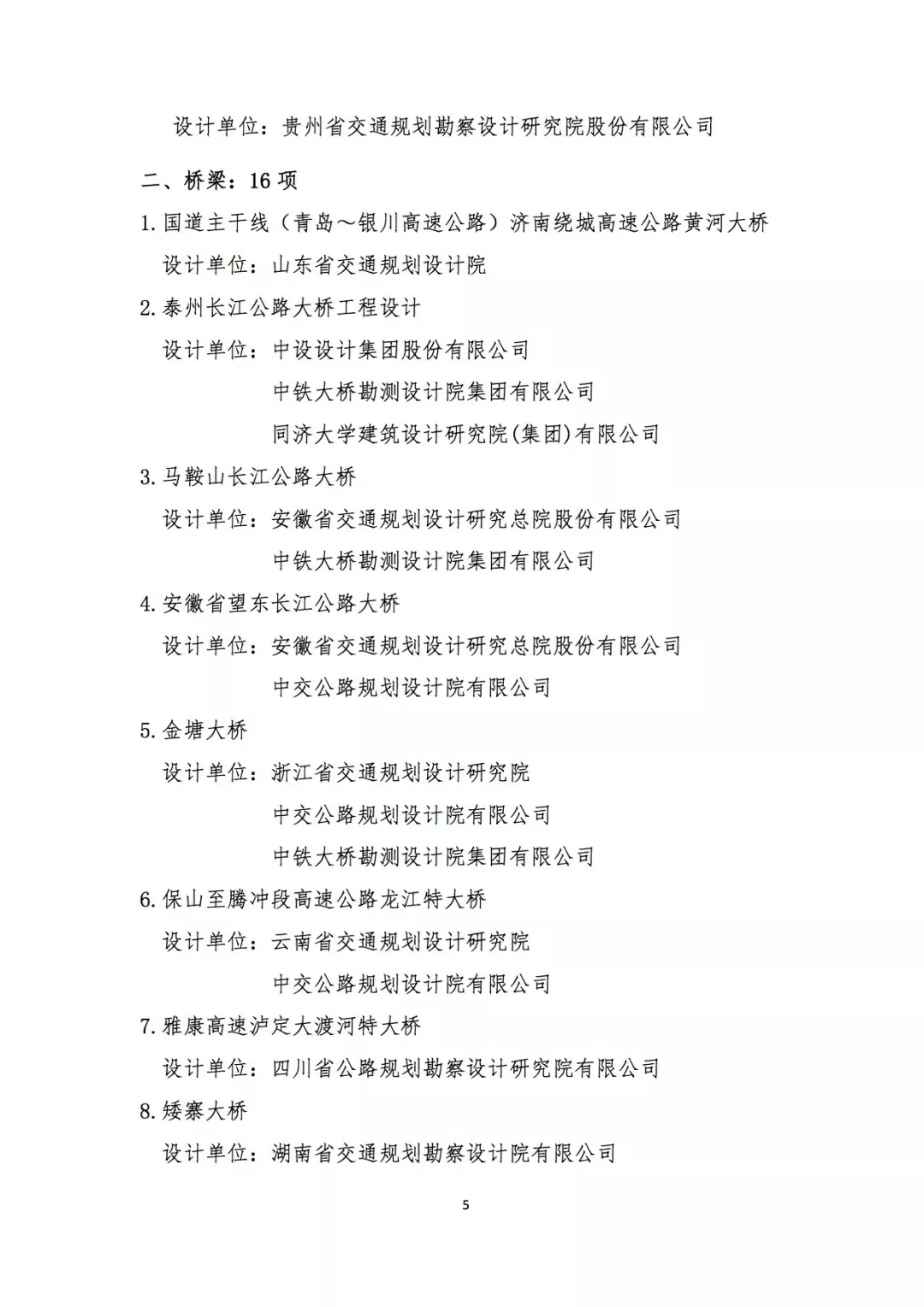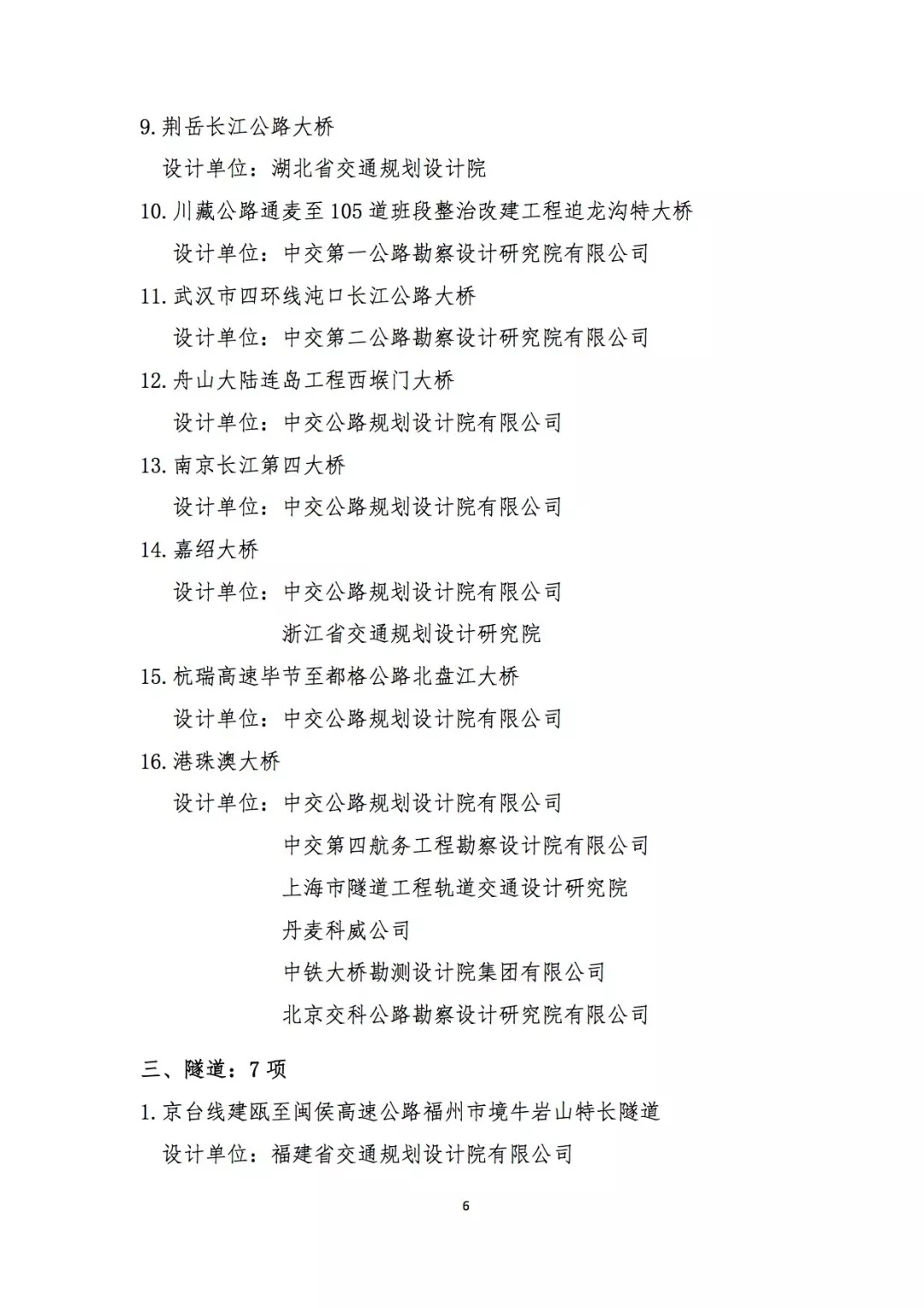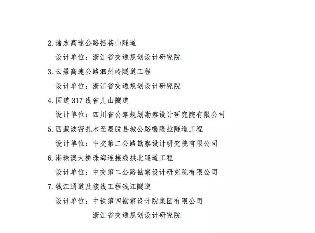 本次獲獎的62個項目中,公路工程39項,橋梁工程16項,隧道工程7項。其中中交公路規劃設計院有限公司參與的14個項目獲獎。