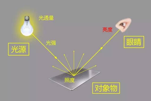 光源或燈具都有一定的光通量,在某一特定方向上產生相應的光強,光線照射到對象物上就產生了照度,光線經過各種反射或折射更后進入人眼,此時人眼所感受到的就是亮度了。
