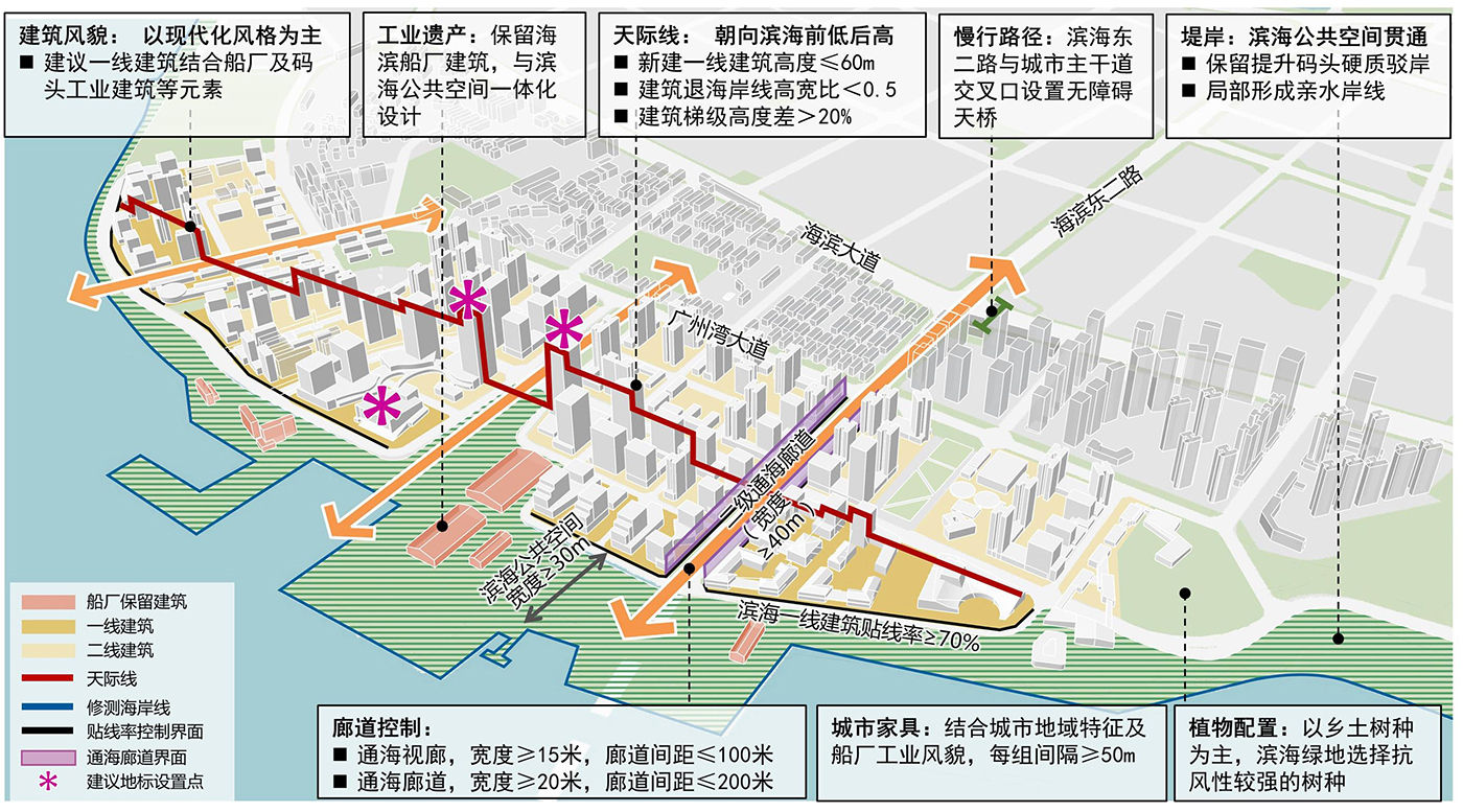 管控要點(diǎn):結(jié)合船廠工業(yè)遺產(chǎn),垂直海岸線控制多條通海廊道??刂菩陆ㄒ痪€建筑高度≤60m,建筑退海岸線高寬比<0.5,建筑梯級(jí)高度差> 20%,形成由濱海向內(nèi)陸前低后高的天際線。