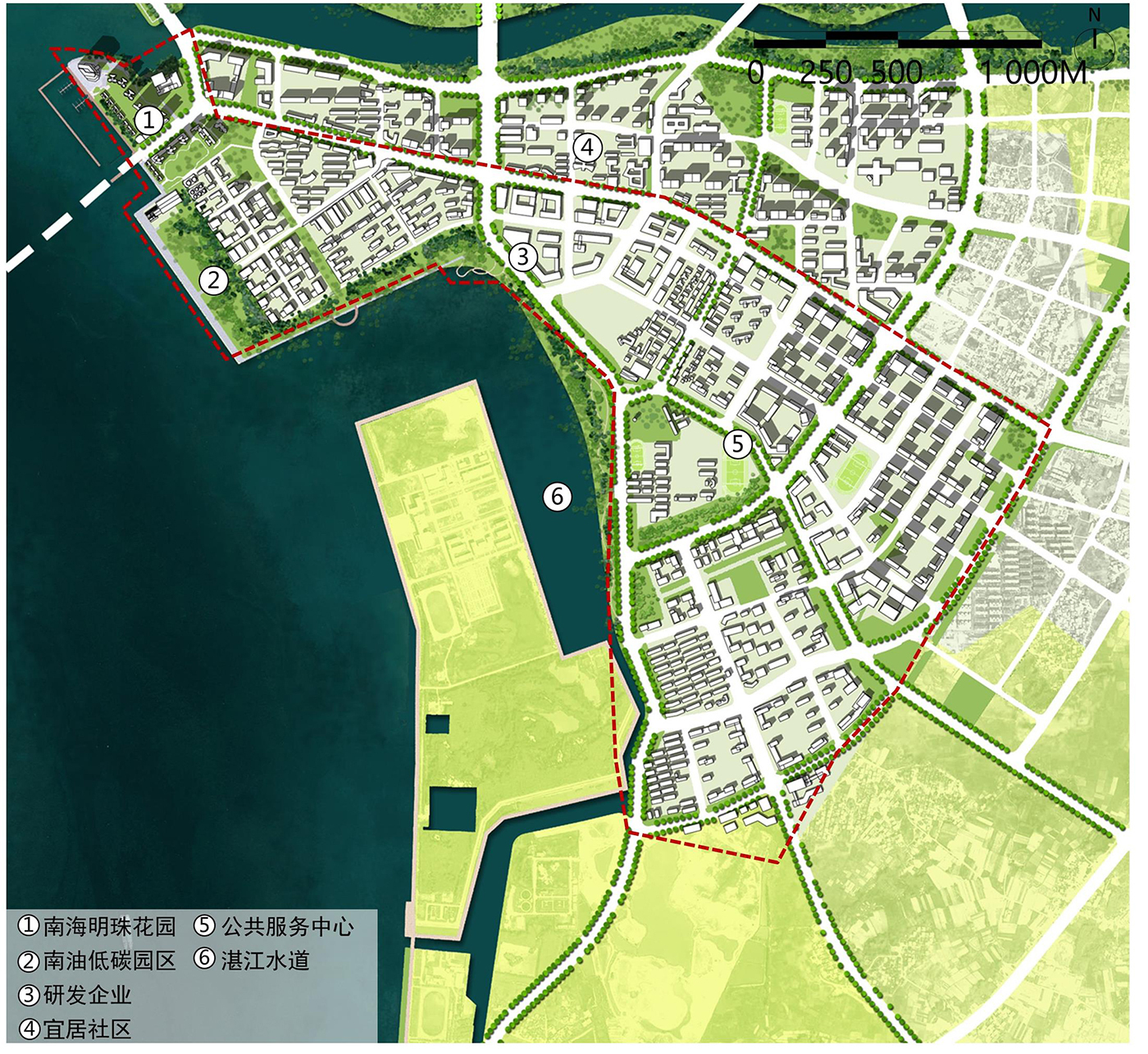 打造湛江現(xiàn)代商貿(mào)服務(wù)區(qū),建設(shè)赤坎河岸產(chǎn)城融合示范區(qū)。釋放文車河河岸低效用地潛力,濱湖打造兩大商貿(mào)文化組團(tuán),分別為文化傳媒產(chǎn)業(yè)園區(qū)、跨境商貿(mào)服務(wù)中心,共同推動(dòng)湛江商貿(mào)數(shù)字化轉(zhuǎn)型。濱水二線為居住組團(tuán),濱湖綠帶沿赤坎河向內(nèi)陸延伸,4條活力街道強(qiáng)化與赤坎老城聯(lián)系,組團(tuán)內(nèi)部靠近赤坎河布置2棟塔樓作為制高點(diǎn),濱水建筑控制前低后高。
