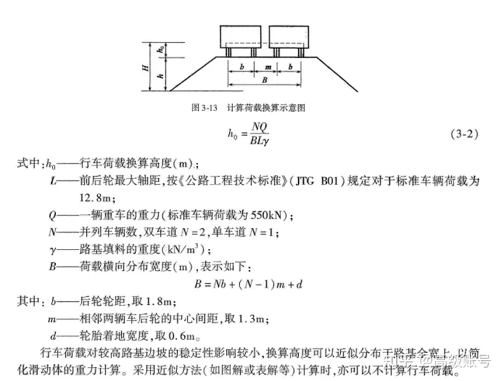 在《公路路基設計規范》(JTG D30-2015)中沒有發現對邊坡穩定計算時行車荷載如何考慮的條文,但是在《路基路面工程》(黃曉明版)和《公路軟土地基路堤設計與施工技術細則》(JTG/T D31-02-2013)中有相關表述。《公路軟土地基路堤設計與施工技術細則》4.1.4-4.1.6條的規定如下,即將行車荷載換算成土柱高度,可按車輛荷載均布于車輛投影面積上換算得出。