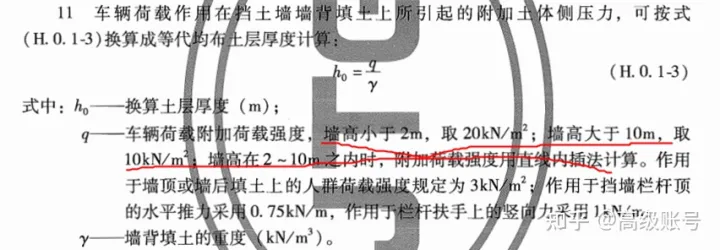 對于擋土墻的結構設計和驗算,在《公路路基設計規范》(JTG D30-2015)的附錄H里對行車荷載如何考慮是有規定的,H.0.1的11條,核心思路也是將車輛荷載換算為對應土柱高度,但是相較穩定計算則考慮的更為簡單,它的車輛荷載附加荷載強度值是給定的,10~20kPa,按照規定取就行了。