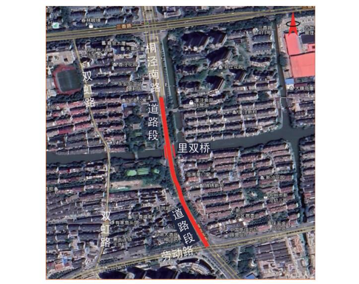 里雙橋重建工程項目范圍為從桐涇南路 - 三香路交叉口下穿段南到桐涇南路 - 勞動路交叉口北側(cè),總長度 502 m。