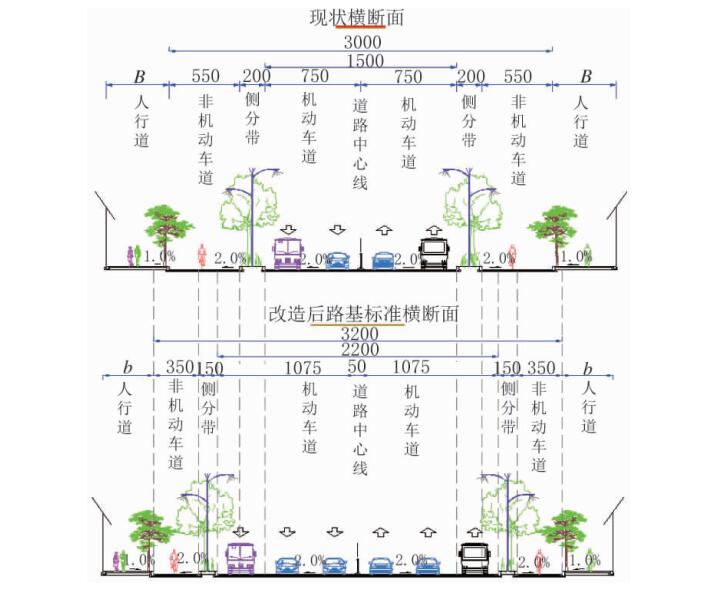 道路現(xiàn)狀為雙向 4 車道,橫斷面布置為 B 人行道 +5.5 m 非機動車道 +2 m 側(cè)分帶 +15 m 機動車道 +2 m 側(cè)分帶 +5.5 m 非機動車道 +B 人行道,B 現(xiàn)狀寬度為不小于 5.5 m。