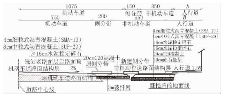 (2)針對拆除側(cè)分帶、壓縮非機動車道改建為機動車道段,建議采用 20 cm C20 混凝土進行處理,新舊路基搭接頂面鋪設(shè) 3 m 玻纖網(wǎng)防止反射裂縫產(chǎn)生。