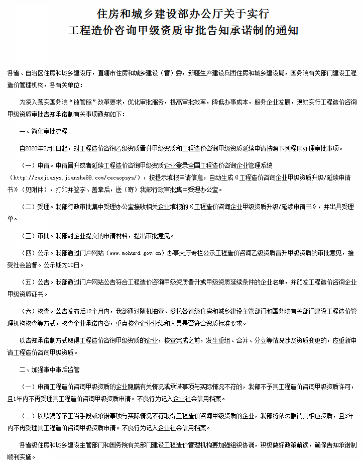 今年四月三十號(hào),就在不久前,住建廳又發(fā)布了廳關(guān)于實(shí)行工程造價(jià)咨詢(xún)甲級(jí)資質(zhì)審批告知承諾制的通知,重點(diǎn)是簡(jiǎn)化審批流程,和加強(qiáng)事中監(jiān)管。