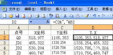 在實際工作中路線導線的坐標數據都是用Excel 表格存放。這樣簡化了在繪圖時輸入坐標的麻煩,在Excel表格中編輯導線點坐標對,如圖11-2 所示,選中D2 欄,輸入公式“C2&" ,"&B2”,按回車鍵,系統自動生成了所需要的坐標對。選中 D2欄,將光標指向第二欄右下角,系統出現黑色小十字標記,按住鼠標左鍵向下拖動十字標記,一直到ZD,D2欄就自動生成了對調后的各交點的坐標對,并將他們依次復制下來。