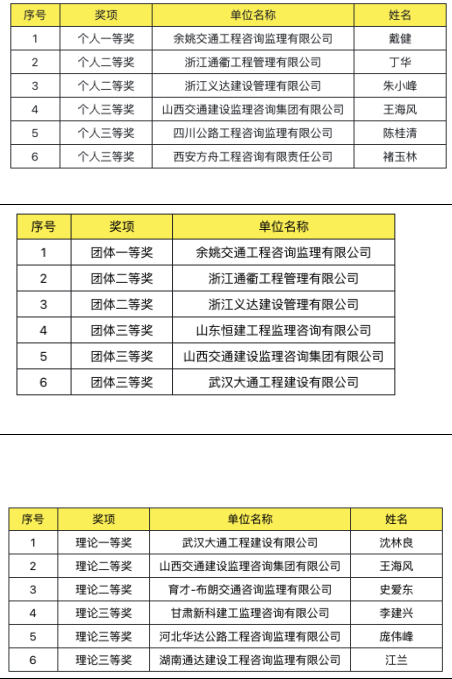 競賽現場賽程緊湊,氣氛緊張,選手靈活運用自己的經驗和技能,尋找現場存在的質量安全問題。經過一天的激烈角逐,裁判組綜合研判,評定出個人、團體、理論獎項如下圖,另有60名選手獲得優勝獎,其中浙江選手包攬個人和團體前三名。
