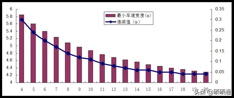 由上圖可以發現,轉彎半徑小于9米時,車道寬度大于5米且遞減值迅速增大。從安全角度和用地角度都可以認為,小于9米的轉彎半徑不夠合理。