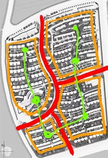 強調南北主線, 通過錯開的方式獲得變化,內部加入環(huán)形路聯(lián)系四個組團中心,適合低密度產(chǎn)品。