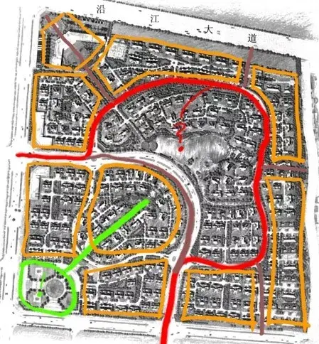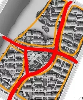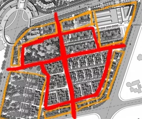 用地中間做環(huán)形道路,向外引出錯落的分支道路,形成各自獨立的組團,中心適宜做景觀。