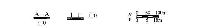 當同一張圖紙中的比例完全相同時,可在圖標中注明,也可在圖紙中適當位置采用標尺標注。當豎直方向與水平方向的比例不同時,可用V表示豎直方向比例,用H表示水平方向比例,見圖2-5(b),