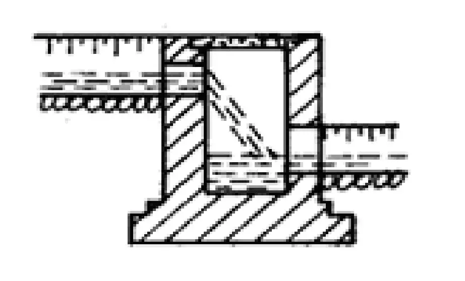 排水溝與其他溝渠相接時應力求水流舒順,因地形限制成直角相交時,可按下圖形式處置: