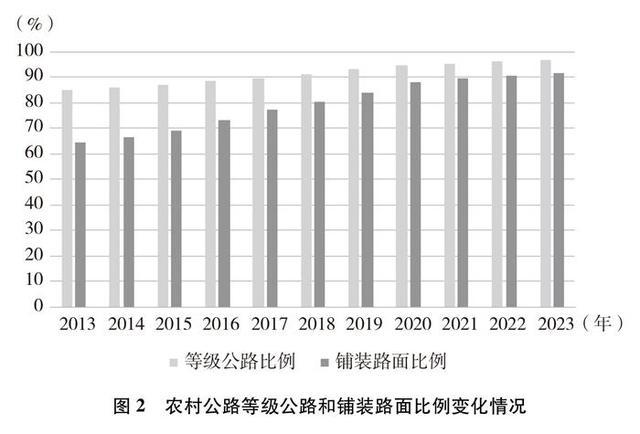 技術等級逐年提高。截至2023年底,農(nóng)村公路等級路②里程及比例分別達到445萬公里和96.8%,鋪裝路面里程及比例分別達到422萬公里和91.8%,十年間分別提高了11.9個百分點、27.2個百分點。