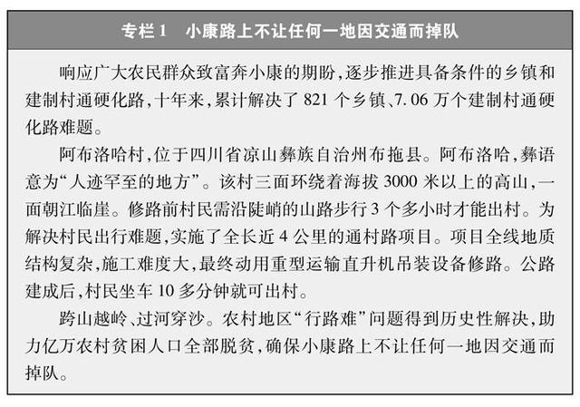“要想富,先修路”。在扶貧相關規(guī)劃與政策指引下,以超常規(guī)舉措和力度,加快貧困地區(qū)農(nóng)村交通發(fā)展。2014年以來,貧困地區(qū)新改建農(nóng)村公路超過140萬公里,新增超過4.5萬個鄉(xiāng)鎮(zhèn)和建制村通客車,2019年實現(xiàn)具備條件的鄉(xiāng)鎮(zhèn)和建制村通硬化路,2020年實現(xiàn)具備條件的建制村通客車,兌現(xiàn)了小康路上不讓任何一地因交通而掉隊的承諾,破解了長期以來制約貧困地區(qū)經(jīng)濟社會發(fā)展的瓶頸,為廣大農(nóng)民邁入全面小康奠定了堅實基礎。