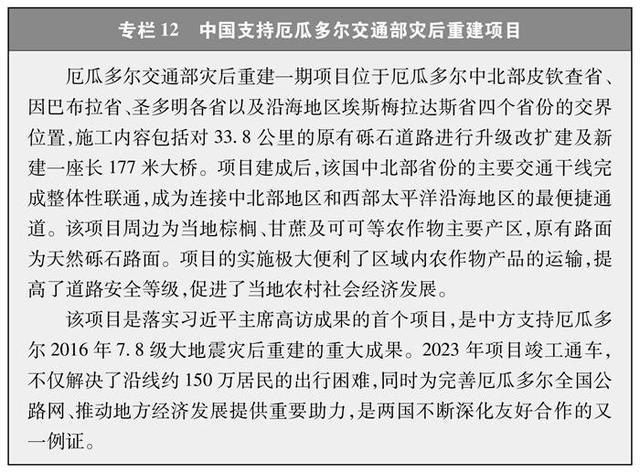 中國積極支持并參與發(fā)展中國家的農(nóng)村公路建設項目,在其他發(fā)展中國家援建了大批農(nóng)村公路基礎設施項目,向世界農(nóng)村公路領域分享中國方案、中國經(jīng)驗。通過參與項目建設、提供技術支持和人力資源,幫助當?shù)馗纳妻r(nóng)村地區(qū)道路基礎條件(專欄12),極大方便當?shù)厝嗣癯鲂校蠓冉档臀锪鞒杀荆鰪姵青l(xiāng)互動,促進當?shù)剞r(nóng)產(chǎn)品的流通和市場接入,對消減貧困、改善民生、提升人民群眾的生活水平,促進當?shù)亟?jīng)濟社會發(fā)展具有重要意義,深受當?shù)匕傩蘸迷u,如中國無償援建的馬達加斯加首都郊區(qū)公路項目,便利了馬哈扎扎鎮(zhèn)雞蛋運輸,促進了當?shù)氐半u養(yǎng)殖業(yè)發(fā)展,這條路被當?shù)厝擞H切地稱作“雞蛋路”。