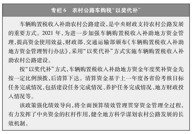 規(guī)范高效用好農(nóng)村公路發(fā)展資金。完善車輛購置稅補助地方資金轉移支付制度,利用“以獎代補”方式支持農(nóng)村公路建設(專欄6),對各級財政用于農(nóng)村公路的資金實施全過程預算績效管理,提高農(nóng)村公路資金使用效益,加強農(nóng)村公路資金使用監(jiān)管,給資金戴上“緊箍咒”。在資金管理和使用上建立“誰申報誰負責”“誰使用誰負責”的責任機制,確保資金實際足額撥付到位,并按有關規(guī)定向社會公開,接受群眾監(jiān)督。加強農(nóng)村公路債務風險防控,依法合規(guī)籌措債務資金。