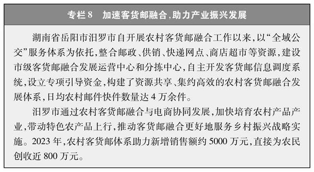 加快推進農(nóng)村客貨郵融合發(fā)展。為統(tǒng)籌解決農(nóng)村客運可持續(xù)運營、快遞下鄉(xiāng)進村和農(nóng)產(chǎn)品出村進城難題,發(fā)布《關于加快推進農(nóng)村客貨郵融合發(fā)展的指導意見》,堅持“政府引導、市場主導”,深入推進農(nóng)村客貨郵運行機制、基礎設施、運輸線路、運營信息等共建共享,加強資源統(tǒng)籌利用,推動融合發(fā)展(專欄8)。截至2023年底,所有省份和超70%地級以上城市建立了交通運輸、郵政、商務、供銷等部門共同參與的工作機制,共開通農(nóng)村客貨郵合作線路1.1萬余條,共建成縣、鄉(xiāng)、村三級客貨郵服務站點9萬余個,形成“客運郵路”“貨郵同網(wǎng)”等典型模式,有效鞏固了通客車成果,農(nóng)村物流、郵政快遞降本增效取得明顯進展,帶動了農(nóng)村電商、特色產(chǎn)業(yè)等蓬勃發(fā)展。